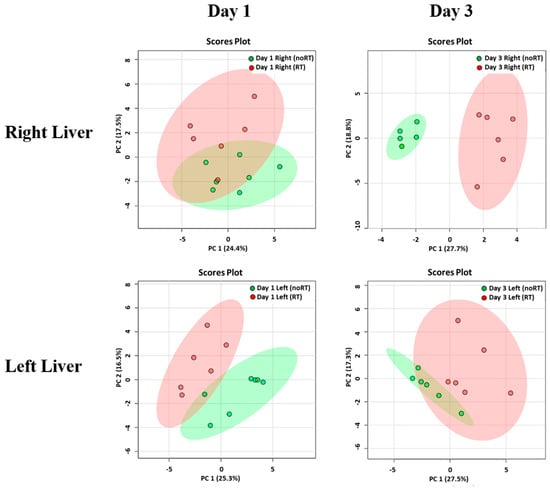 Principal component analysis of metabolite distribution in the RT (n = 6) and no-RT (n = 6) groups on the first and third post-irradiation days. Results are reported separately for the right and left lobes of the liver using partial least squares discriminant analysis. The areas (red for the RT group and green for the no-RT group) comprised within the elliptical rings indicate a 95% confidence level. A clear discrimination between the two experimental groups was observed for the right liver on the third post-irradiation day.