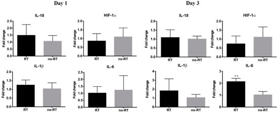 Expression levels of genes encoding for pro-inflammatory cytokines in the RT (n ≥ 3) and no-RT (n ≥ 3) groups on the first and third post-irradiation days (right lobe of the liver). On the third post-irradiation day, the expression levels of the IL-6 gene (expressed as fold-change) were significantly increased in the RT group—but not in the no-RT group. ** p < 0.01.
