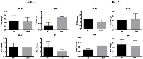 Expression levels of genes encoding for gluconeogenesis-associated enzymes in the RT (n ≥ 3) and no-RT (n ≥ 3) groups on the first and third post-irradiation days (right lobe of the liver). On the first post-irradiation day, the expression levels of the G6PC gene (expressed as fold-change) were significantly lower in the RT group. On the third post-irradiation day, the expression levels of the FBP1 gene (expressed as fold-change) were significantly lower in the RT group. These results indicate the temporal shift from gluconeogenesis to glycolysis in the irradiated liver parenchyma. * p < 0.05; ** p < 0.01.
