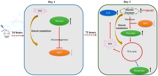 Shift in metabolic pathways from the first to the third post-irradiation day (right lobe of the liver). On the first post-irradiation day, radiation-induced production of reactive oxygen species (ROS) inhibited gluconeogenesis (as reflected by a reduced expression of the G6PC gene). On the third post-irradiation day, there was a shift towards glycolysis as reflected by a reduced expression of the FBP1 gene accompanied by an accumulation of pyruvate, glutamate, and the activation of the tricarboxylic acid cycle (TCA). The complex interplay between the activation of glycolysis and the presence of ROS also elicited an inflammatory response with an increased expression of IL-6. The metabolic shift occurring on day 3 can explain the significantly increased hepatic 18F-FDG uptake observed on 18F-FDG PET imaging at this time point.