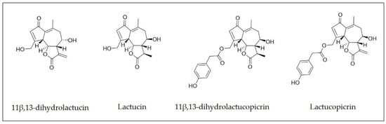 - Wesołowska, A.; Nikiforuk, A.; Michalska, K.; Kisiel, W.; Chojnacka-Wójcik, E. Analgesic and sedative activities of lactucin and some lactucin-like guaianolides in mice. J. Ethnopharmacol. 2006, 107, 254–258. [Google Scholar] [CrossRef]