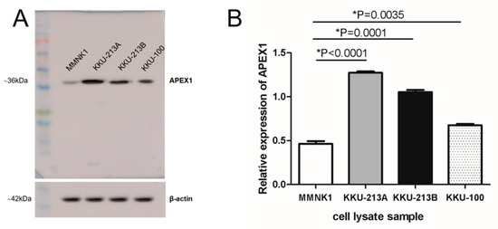 Expression of APEX1 in three CCA cell lines and immortalized cholangiocyte cell line MMNK1. (A) Western blot analysis showed a high expression of APEX1 in KKU-213A and KKU-213B. β-actin was used as a control for protein loading. (B) APEX1 protein expression was determined using quantitative image analysis. Relative expression of APEX1 was the intensity ratio of APEX1 and β-actin.