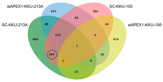 Efficacy of APEX1 silencing was presented by mass spectrometric data with the signal intensity of all proteins of cell lysates before and after APEX1 silencing of KKU-213A and KKU-100 cell lines. Overlapping and unique proteins were identified using jvenn software (http://jvenn.toulouse.inra.fr/app/example.html/ (Accessed on 11 November 2020) [31]. To speculate on the active role(s) of APEX1 in CCA and its possible signaling pathway, proteins that were uniquely expressed in scramble-treated KKU-213A and KKU-100 cells but not siRNA-treated cells were selected as the candidate protein group.