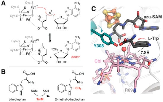 - Knox, H.L.; Chen, P.Y.-T.; Blaszczyk, A.J.; Mukherjee, A.; Grove, T.L.; Schwalm, E.L.; Wang, B.; Drennan, C.L.; Booker, S.J. Structural basis for non-radical catalysis by TsrM, a radical SAM methylase. Nat. Chem. Biol. 2021. [Google Scholar] [CrossRef] [PubMed]
