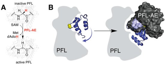 Although the most common applications of molecular docking involve small-molecule ligands such as Tyr, it is possible to employ docking approaches for determining protein–protein interactions [15]. Such macromolecular complexes are notoriously difficult to crystallize, and no rSAM enzyme has been structurally characterized bound to its protein substrate to date. Instead, truncated peptide mimics have been employed to investigate the structural basis for reactivity in both the anaerobic sulfatase-maturating enzyme (anSME) from Clostridium perfringens and PFL-AE, introduced above [16]. The latter abstracts a H atom from PFL to generate a stable glycyl radical which is used in the conversion of pyruvate and coenzyme A to formate and acetyl-CoA (Figure 2A) [17]. Vey et al. expanded upon their crystallographically obtained model using ZDOCK to predict binding to a 48-residue fragment of PFL that contains the catalytic glycine residue and is proposed to contact the activating enzyme (Table 1) [8,18]. Their results not only account for two patches of sequence conservation on the surface of PFL-AE, but further led to the proposal of concerted conformational changes in the two proteins. Namely, they hypothesize that loop motion in PFL-AE occurs in tandem with hinged motion of the radical-containing domain in PFL to facilitate binding and protect the radical post formation (Figure 2B). It should be noted that docking simulations do not perfectly duplicate the interactions observed for the peptide mimic. It is unclear whether these discrepancies are expected based on differences in KM or whether this is a function of rigid body modeling. Computational advancements over the past decade have made incorporating ligand flexibility more accessible and subsequent studies, such as those investigating the rSAM enzyme SuiB, have benefited from this consideration [19].