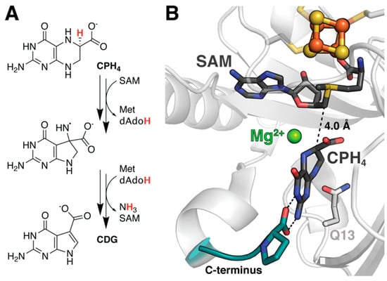 In fact, molecular docking is often used as a preparative step for downstream MD or QM/MM analysis, and a similar evaluation of substrate scope was performed for 7-carboxy-7-deazaguanine synthase (QueE) from B. multivorans with an eye toward engineering alternative reactions [30]. QueE catalyzes the Mg2+-dependent rearrangement of 6-carboxytetrahydropterin (CPH4) to 7-carboxy-7-deazaguanine (CDG), the basic building block for more than 30 natural products in addition to the tRNA base queuosin (Figure 4A) [31]. Docking approaches performed in tandem with DFT calculations of radical stabilization energies demonstrated that either less stabilization or the ability to persist in a non-preferred conformation is required for ligands to serve as alternative substrates of this enzyme. As with viperin, these studies were enhanced by MD simulations detailed below.