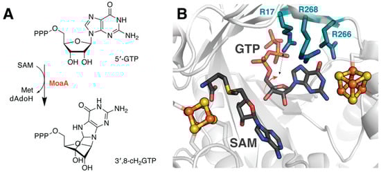 Active site residues facilitate MoaA catalysis. (A) Reaction catalyzed by MoaA. (B) DFT studies indicate that arginine residues lining the MoaA substrate binding pocket play a role in modulating reaction energetics. These calculations further suggests that reorientation of the ribose moiety enables a key interaction with Arg17 to stabilize the transition state. Structure shown from PDB accession code 2FB3, excluding SAM, which was aligned from 1TV8.