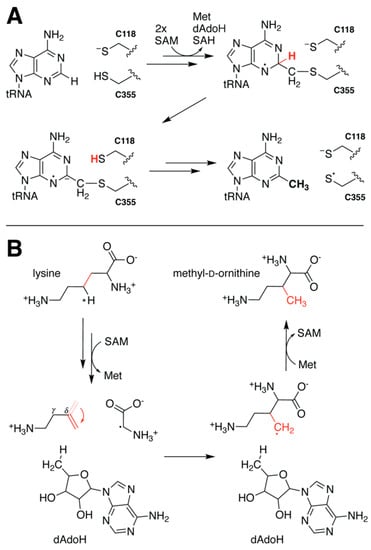 - Grove, T.L.; Benner, J.S.; Radle, M.I.; Ahlum, J.H.; Landgraf, B.J.; Krebs, C.; Booker, S.J. A radically different mechanism for S-adenosylmethionine–dependent methyltransferases. Science 2011, 332, 604–607. [Google Scholar] [CrossRef] [PubMed]