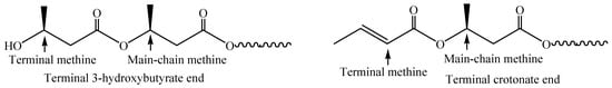 A typical experimental procedure for the preparation of ORHB is as follows. A mixture of the commercially available PRHB (0.54 g) with sodium hydroxide (0.89 g) and chloroform (80 mL) was ultrasonicated at 50 °C for 1 h and then stirred at room temperature for 7 h. The reaction mixture was washed successively with 1 mol/L hydrochloric acid (5.0 mL) and water (80 mL). The chloroform layer was dried over anhydrous sodium sulfate, filtered, evaporated, and dried under reduced pressure to give ORHB (0.16 g). 1H-NMR (CDCl3): δ 1.22–1.27 (m, CH3 of main-chain), 1.85–1.88 (m, CH3 of terminal crotonate), 2.42–2.68 (m, CH2 of main-chain), 4.11–4.18 (m, CH of terminal 3-hydroxybutyrate), 5.18–5.36 (m, CH of main-chain), 5.76–5.87, 6.91–7.03 (m, =CH of terminal crotonate) (Figure 1). From the integrated ratio of the terminal methine signals at δ 4.11–4.18 and 5.76–5.87 to the main-chain methine signals at δ 5.18–5.36, the MW value was calculated to be ~530.