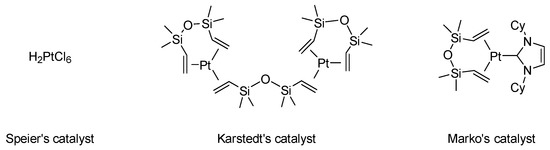 - Marciniec, B. Catalysis of hydrosilylation of carbon-carbon multiple bonds: Recent progress. Silicon Chem. 2002, 1, 155–174. [Google Scholar] [CrossRef]