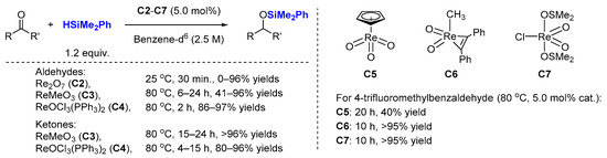Intrigued by the work of Toste, Royo et al. explored in 2005 the catalytic activity of a family of oxo-rhenium complexes (C2–C7, Scheme 2) [28]. All these complexes showed activity in the reduction of aliphatic and aromatic aldehydes (six examples) and ketones (four examples) with dimethylphenylsilane in C6D6 solution (Scheme 2), demonstrating the general ability of oxo-rhenium complexes to promote hydrosilylation. Notably, C2 catalyzes the hydrosilylation of aldehydes at room temperature, within 30 min, affording the corresponding silyl ethers in a good yield, but is ineffective as a ketone hydrosilylation catalyst (even at 80 °C). C5–C7 (5.0 mol%) are active for the hydrosilylation of 4-trifluoromethylbenzaldehyde at 80 °C, giving 40% yield (C5, 20 h), >95% yield (C6, 10 h) and >95% yield (C7, 10 h), respectively.