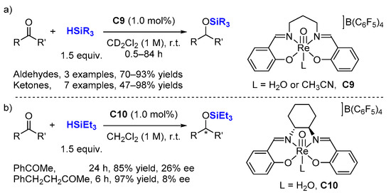 Then, Abu-Omar and co-workers prepared a number of cationic oxorhenium(V) salen based complexes such as [Re(O)(salpn)(Solv)][B(C6F5)4] C9 [31,32] in 2006 (Scheme 4a) and [ReO(saldach)(H2O)][B(C6F5)4] C10 [33] in 2008 incorporating a chiral environment, (Scheme 4b). C9 and C10 serve as good catalysts for hydrosilylation of carbonyl compounds (1.0 mol% cat. loading, 1.5 equiv. silane, room temperature (r.t.), although asymmetric versions (C10) of these reactions afford poor enantioselectivity, even in the presence of bulky silane such as HSitBuMe2.