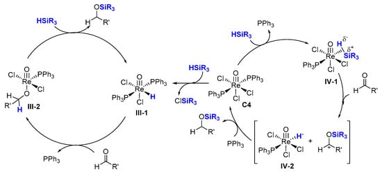 The mechanism of action of these high-valent mono-oxo-rhenium(V) catalysts was investigated, providing new insights [34] including via a theoretical study [35,36,37]. The addition of silane across the Re-O multiple bond was not observed in mono-oxo-rhenium(V) complex Re(O)Cl3(PPh3)2 (C4) catalyzing the hydrosilylation of carbonyls. Furthermore, they observed that silanes slowly reacted with C4 to give the isolated hydride intermediate Re(O)Cl2H(PPh3)2 (III-1). However, this isolated hydride intermediate is not sufficiently reactive to account for the catalytic turnover, as only 20% yield of the silyl ether product is observed (Scheme 5 left). These observations lead the authors to propose that the reaction pathway involves the formation of a η2–silane complex (IV-1), followed by the heterolytic cleavage of the Si-H bond at the rhenium center after elimination of one PPh3 ligand (Scheme 5, right). This ionic mechanism involves the sequential transfer of a silyl ion (R3Si+) and then a hydride to a polar double bond to furnish the reduction reactions. In this proposed catalytic cycle, neither the coordination of unsaturated substrates to the metal center nor its insertion into the M-H bond is involved.