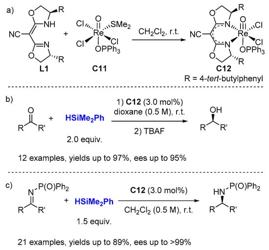 The enantioselective reduction of prochiral ketones [38] and imines [39] with 2 equiv. HSiMe2Ph was reported by Toste (Scheme 6) using chiral (CN-box)Re(V)–oxo complexes (3.0 mol%, CN-Box = cyanobis(oxazoline)). These reduction reactions proceed under an ambient air atmosphere with a highly functional group tolerant with ees of up to >99%. The (CNbox)Re(V)–oxo complexes (C12) can be prepared by simply stirring L1 with Re(O)Cl3(OPPh3)(SMe2) (C11) in CH2Cl2 at r.t. and isolated as a green stable solid (Scheme 6a) or generated directly in situ.