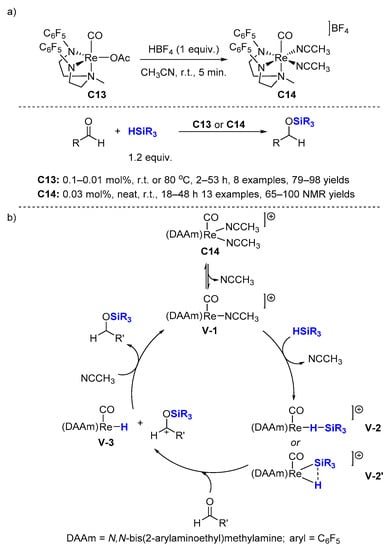 Based on kinetic and mechanistic studies, an ionic outer-sphere mechanism for the catalytic hydrosilylation of benzaldehyde by C14 has been proposed (Scheme 7b). First, silane is activated through η1 (V-2) or η2 (V-2′) coordination to the rhenium center. Then, the aldehyde substrate attacks the Si center in (V-2) or (V-2′) to prompt the heterolytic cleavage of the Si-H bond yielding an ion pair, the hydride complex V-3 and a silylated aldehyde ion. Finally, hydride transfer from rhenium to the carbonyl carbon of the activated substrate completes the catalytic cycle [43].