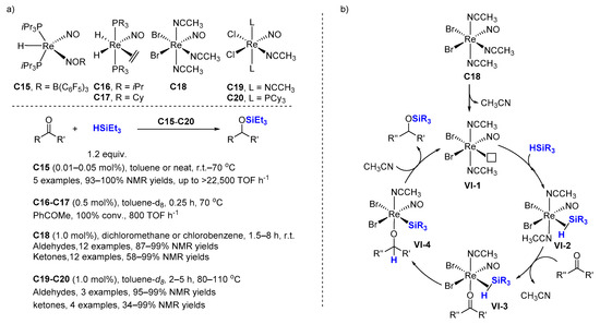 Berke and co-workers reported several easily available nitrosyl-rhenium complexes, for example, Re(H)(PiPr3)2(NO)(NOB(C6F5)3) (C15) [44] in 2005, Re(H)2(η2-C2H4)3(NO)(PR3)2 (C16, R = iPr, C17, R = Cy) [45] in 2008, Re(CH3CN)3Br2(NO) (C18) [46] in 2009, Re(CH3CN)3Cl2(NO) (C19) [47] and Re(CH3CN)Cl2(NO)(PCy3)2 (C20) [47] in 2011. Those nitrosyl rhenium complexes were employed in the catalytic hydrosilylation of a variety of carbonyl compounds (Scheme 8a). Hydrosilylations of carbonyl compounds were carried out with the catalyst C15, HSiR3 (1 equiv., R = Et or Ph) from r.t. to 70 °C either in toluene or under solvent-free conditions. TONs up to 9000 and TOFs up to 22,500 h−1 were observed. C16 and C17 exhibited similar activity in hydrosilylation of acetophenone (0.5 mol% cat. loading at 70 °C in toluene-d8, giving full conv. and TOF up to 800 h−1).