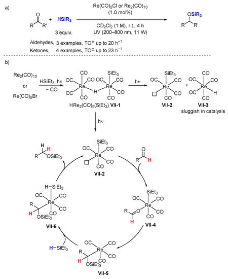 Upon photolysis, the dimer complex VII-1 dissociates to afford Et3SiRe(CO)4 (VII-2) and HRe(CO)5 (VII-3) which was found to be inactive in catalysis. Then, the coordination of the carbonyl substrate to the vacant site of VII-2 facilitates the silyl ligand shift onto the oxygen atom and forms an alkyl ligand bound to the Re center VII-5. Another silane coordinates to the Re center in VII-5 via a η2-silyl complex or a σ-silyl (σH) complex. Migration of a H atom from the silane to the alkyl group yields the silyl ether product and regenerates the catalyst VII-2. When either the carbonyl or silane has been depleted, the Et3SiRe(CO)4 complex(VII-2) coordinates back to HRe(CO)5 (VII-3) and becomes part of the resting state VII-1.