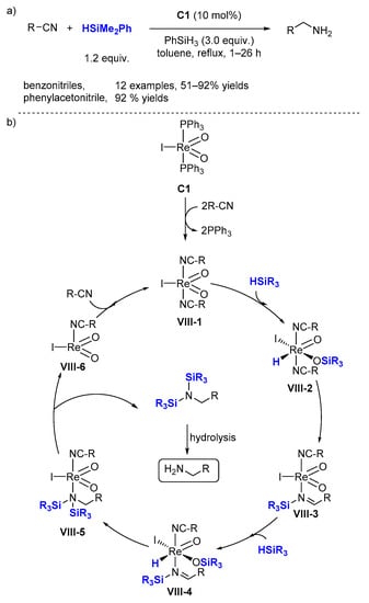 Then, the catalytic cycle was proposed by the same author (Scheme 10b): Replacing two phosphine ligands with two nitriles at the rhenium center in C1 produces complex ReIO2(nitrile)2 (VIII-1). The addition of the Si-H bond to one of the oxo-rhenium bond results in the formation of the hydride species (nitrile)2(O)IRe(H)OSiR3 (VIII-2). Dihydrosilylation of the nitrile to the corresponding N,N-disilylamino-rhenium complex VIII-5, followed by hydrolysis of the N-disilylamine, affords the primary amine as product.