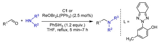 The direct reductive amination of aldehydes with primary and secondary anilines [50], using the same oxorhenium complex C1, was achieved by the group of Fernandes. A large variety of functional groups, such as nitro, sulfone, ester, nitrile, amide, halides including iodide, were well tolerated, using 2.5% of catalyst loading under refluxing THF for 5 min to 7 h (Scheme 11) [51]. The same mechanism as in Scheme 10 was proposed by the authors. In 2013, the same group has reported a series of oxorhenium complexes containing heterocyclic ligands, which were found to also be very efficient catalysts for such transformation. For instance, similar efficiency and chemoselectivity were obtained with the oxo-rhenium complex [ReOBr2(L)(PPh3) C23 (L = 2-(2′-hydroxy-5′-methylphenyl)benzotriazole) (Scheme 11) [52].
