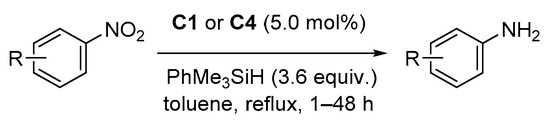 In 2009, the group of Fernandes also reported the reduction of aromatic nitro compounds to the corresponding amines with silanes catalyzed by high valent oxo-rhenium complexes C1 or C4 in the presence of 3.6 equiv. of PhMe2SiH in refluxing toluene conditions for 1–48 h (Scheme 13) [54]. Aniline derivatives were then isolated in moderate to good yields (31–96%). It is noticeable that this catalytic transformation tolerated a huge variety of functional groups such as halides, esters, amides, sulfones and nitriles. By contrast, the hydrosilylation of nitroalkanes, such as 2-nitroethylbenzene, led to the corresponding nitrile in 38% yield.