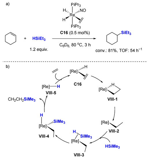 Interestingly, rhenium mono-nitrosyl complex C16 developed by Berke et al., can also promote the catalytic hydrosilylation of cyclohexene [45] (Scheme 16a) under similar conditions that those employed for ketones (0.5 mol% cat., 80 °C, 3 h). This process was investigated theoretically by the group of Li with ethylene and trimethylsilane as model reactants (Scheme 16b) [59]. The proposed catalytic cycle starts with the insertion of the ethylene ligand into the Re-H bond, followed by the cleavage of the agostic interaction involved in VIII-1 to afford VIII-2. Then, a silane molecule coordinates to the Re center to give a σ complex VIII-3. The next step involves an oxidative addition process to afford a seven coordinate complex VIII-4. Last step consists of a reductive elimination process to form the product. The catalytic cycle completes by coordination of an ethylene to VIII-5.
