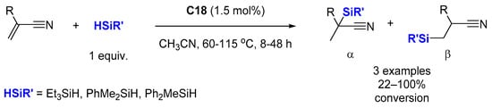 In 2014, the same group reported a highly selective hydrosilylation of acrylonitrile and its derivatives catalyzed by C18 (1.5 mol%) by reaction with alkyl or aryl silanes (1 equiv.) at 60–115 °C in 8–48 h (Scheme 17) [60]. The regioselectivity of all the reactions were found to be around α:β = 3:1. Improved regioselectivity was obtained with a high ratio of acrylonitrile:silane.