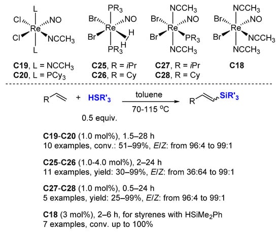 Dehydrogenative silylation is often considered an undesired side reaction in the hydrosilylation of alkenes, but the selective production of vinylsilanes is also a valuable transformation. In this context; Berke et al. reported several rhenium mono-nitrosyl complexes (C18 [60], C19–C20 [47], C25–C26 [61], C27–C28 [62]) catalyzing the dehydrogenative silylation of alkenes with high chemoselectivity to produce silyl alkenes, along with the corresponding alkanes, with 1.0–4.0 mol% cat., at 70–110 °C in toluene-d8 (Scheme 18). Hydrosilylation products appear only rarely in very minor amounts. The complexes C19–C20 and C27–C28 gave better E/Z selectivity (96:4→99:1). Noticeably, ethylene can be transformed quantitatively into the corresponding dehydrogenative silylation product with C27–C28 as catalysts with a ratio dehydro/hydro silylation products of 79:21 and 68:32, respectively. C18 catalyzes the dehydrogenative coupling of styrene derivatives with HSiMe2Ph leading to dehydro/hydro silylation products in ratio of about 85/15.