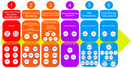 In this study, different molecular docking programs and different PDB structures were used in a consensus approach. This approach can explore many potential ligands with greater accuracy, contributing to a more rigorous selection of the molecules for testing. From the top solutions in the ranked lists obtained from the VS, 10 molecules from each library were selected for the MD simulations. For each library, the selection was based on the position of the molecules on the different VS protocols. The choice took into consideration the following criteria: (i) molecules among the top 25 solutions for the two structures considered in the VS; (ii) molecules among the top 25 solutions with more than one scoring function; (iii) molecular diversity taking into consideration the physical-chemical properties (Figure 3).