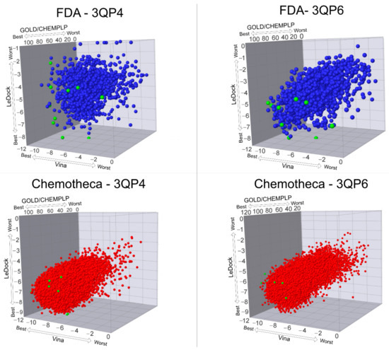 The optimized protein–ligand docking and virtual screening protocols were then applied to two libraries of compounds: the US Food and Drug Administration (USFDA) approved database available on ZINC (ZINC/FDA) to consider possible drug repurposing alternatives, and the more general Mu.Ta.Lig. Virtual Chemotheca. The results of all virtual screenings are in Figure 2.