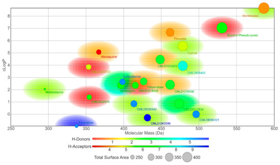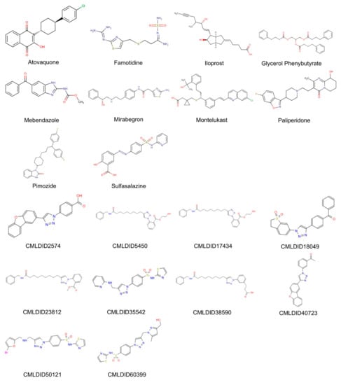 The molecules from the ZINC/FDA database were atovaquone, famotidine, iloprost, mebendazole, mirabegron, montelukast, paliperidone, pimozide, glycerol phenylbutyrate, and sulfasalazine (Figure 4). The molecules from Chemotheca were CMLDID2574, CMLDID5450, CMLDID17434, CMLDID18049, CMLDID23812, CMLDID35542, CMLDID38590, CMLDID40723, CMLDID50121 and CMLDID60399 (Figure 4). As a display of the variability of the selected molecules, multiple important properties (cLogP, molecular mass, total surface area, hydrogen donors and acceptors) of the 20 selected molecules are displayed in Figure 3. These properties and graphs were calculated using the data visualization and analysis program, DataWarrior [76]. Comparisons between the score of the 20 selected molecules and the scores obtained by the known active molecules is available in Figures S2–S7 in the supplementary materials.
