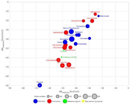 The results demonstrate that most ligands present a lower affinity towards CviR than the reference ligands (MM/GBSA predicted values between −22.7 ± 0.1 and −67.2 ± 0.2, against −49.0 ± 0.2 and −51.0 ± 0.2 kcal/mol and MM/PBSA predicted values between −13.0 ± 0.1 and −89.6 ± 0.2, against −51.7 ± 0.2 and 59.6 ± 0.2 kcal/mol) The only ligand from the ZINC/FDA database, which displays higher affinity towards CviR is pimozide (−67.2 ± 0.2 and −89.7 ± 0.2 kcal/mol, respectively). Pimozide is used as an antipsychotic agent and for the suppression of vocal and motor tics in patients with Tourette syndrome. Although its exact mechanism of action is unknown, it is thought that it inhibits the dopamine D2 receptor [78].