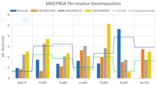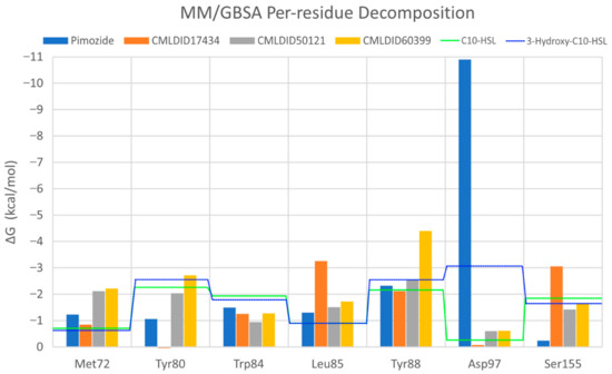 Overall, the residues with the greatest contribution for the affinity of the ligands towards CviR are Met72, Tyr80, Trp84, Leu85, Tyr88 and Ser155. For pimozide, the bigger contribution is obtained from Tyr80 (MM/PBSA), Tyr88 (MM/GBSA), and Asp97. Whereas on most ligands, the calculations show a less favorable contribution from this residue, with pimozide, it is the major contribution for the affinity between the ligand and the protein. For CMLDID17434, the residues with the highest contribution to the overall result using both methods are Leu85, Tyr88 and Ser155. In the case of CMLDID50121, Tyr80, Leu85 and Tyr88 are the residues with the most impact in the predicted affinity towards CviR. Lastly, for CMLDID60399, the amino acids with the greater impact are Met72, Tyr80, Tyr88.