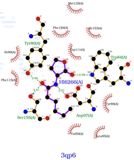 - Wallace, A.C.; Laskowski, R.A.; Thornton, J.M. LIGPLOT: A program to generate schematic diagrams of protein-ligand interactions. Protein Eng. Des. Sel. 1995, 8, 127–134. [Google Scholar] [CrossRef]