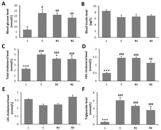 Effects of bee bread (BB) on levels of blood glucose (A), blood insulin (B), total cholesterol (C), high-density lipoprotein (HDL) cholesterol (D), low-density lipoprotein (LDL) cholesterol (E), triglyceride (F) in Zucker diabetic fatty (ZDF) rats. * Significant differences compared with C group (p < 0.05), *** significant differences compared with the C group (p < 0.001), # significant changes in relation to the L group (p < 0.05), ## significant changes in relation to the L group (p < 0.01), and ### significant changes in relation to the L group (p < 0.001).