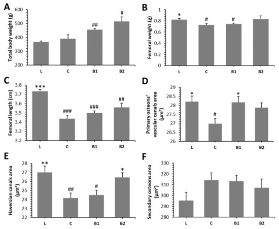 The post-treatment body weight (BW) in both BB-treated groups was higher than that determined in lean rats. Significantly decreased femoral weight (FW) was observed in the C and B1 groups versus the L group. No significant difference in FW between L and B2 groups reflects a beneficial effect of a higher dose of BB on this parameter. However, total BW, femoral length (FL), and FW were non-significantly higher in the B1 and B2 groups as compared to the C group. The results are presented in Figure 2A–C.