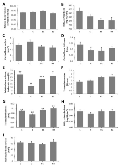 Effects of BB on morphological 3D parameters of the cortical bone (A–D) and trabecular bone (E–I) in ZDF rats. BMD—bone mineral density. * Significant differences compared with the C group (p < 0.05), ** significant differences compared with the C group (p < 0.01), *** significant differences compared with the C group (p < 0.001), # significant changes in relation to the L group (p < 0.05), and ## significant changes in relation to L group (p < 0.01).