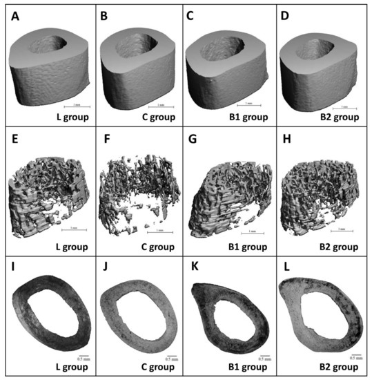 Treatment with BB had an insignificant effect on relative bone volume (BV/TV) of cortical bone, cortical bone surface (BS), and BMD. Despite this, significantly decreased cortical bone thickness (Ct.Th.) was recorded in the C and B1 groups versus the L group. No significant changes between L and B2 groups insinuate a positive impact of a higher dose of BB on Ct.Th. The results are provided in Figure 3A–D. Figure 4A–D shows representative reconstructed 3D images of the cortical bone. Compared with diabetic control rats, rats from both the B1 and B2 groups had significantly elevated relative bone volume (BV/TV) of the trabecular bone and trabecular thickness (Tb.Th.). No significant impact of BB administration on trabecular number (Tb.N.), BMD, and trabecular bone surface (BS) was recorded. The data are shown in Figure 3E–I. Figure 4E–H illustrates representative reconstructed 3D images of the trabecular bone.