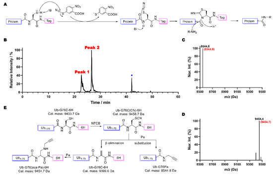 (A) Mechanism of ACPL approach using NTCB as a cyanide donor. (B) The HPLC chromatogram of products after the ACPL reaction between Ub-G76C-6H and Pa: * indicates the solvent peak. (C) The deconvoluted and integrated ESI-MS spectrum of Peak 2 of B. The parenthesized number colored in red is the theoretical molecular weight of the conjugation production of Ub-G76Pa (Pa replaces G76C-6H in Ub-G76C-6H). (D) The deconvoluted and integrated ESI-MS spectrum of Peak 1 of B. The parenthesized number colored in red is the theoretical molecular weight of the product in which Pa replaces the thiol group in Ub-G76C-6H. (E) A diagram showing two reaction pathways of a cyanylated Ub-G76C-6H product, one undergoing conjugation with Pa and the other undergoing beta elimination to form Dha and then aza-Michael addition with Pa.