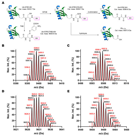 NTCB induced Dha formation in Ub-G76C-6H. (A) Pathways for the formation of four different possible products when Ub-G76C-6H reacts with NTCB. Deconvoluted ESI-MS spectra of (B) the Dha product Ub-G76Dha-6H, (C) the hydrolysis byproduct Ub(1-75), (D) the cyanylated intermediate, Ub-G76C(CN)-6H, and (E) the TNB conjugate Ub-G76C(TNB)-6H. Black lines show the detected monoisotopic mass peaks and their relative intensities. Red lines refer to the calculated theoretical monoisotopic peaks and their relative intensities.
