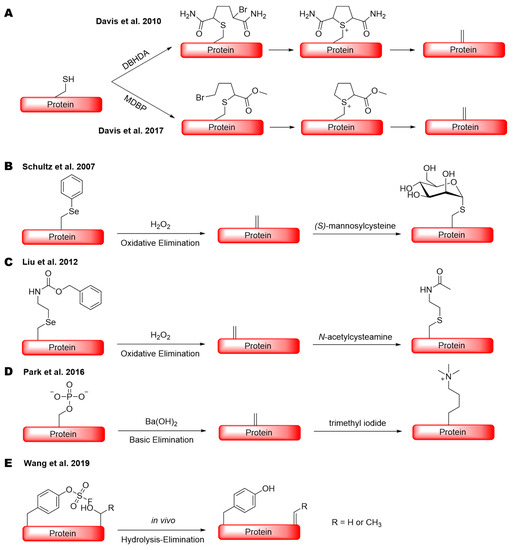 - Dadová, J.; Galan, S.R.; Davis, B.G. Synthesis of modified proteins via functionalization of dehydroalanine. Curr. Opin. Chem. Biol. 2018, 46, 71–81. [Google Scholar] [CrossRef] [PubMed]