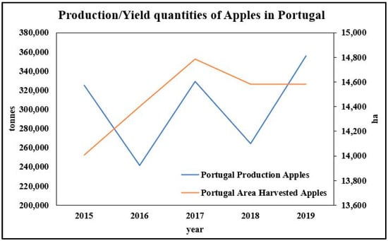 Production (in tons) and occupied area (ha) of apples in Portugal in the quinquennium 2015–2019. Source: Adapted from FAOSTAT (2020).