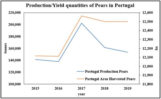 Production (in tons) and occupied area (ha) of pears in Portugal in the quinquenium 2015–2019. Source: Adapted from FAOSTAT (2020).