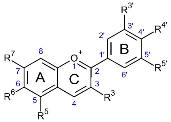 Anthocyanins are water-soluble antioxidants pigments that belong to a polyphenol-based flavonoids family due to their characteristic C15 skeleton based on C6-C3-C6 core structure [17]. Chemically, anthocyanins are polyhydroxylated and/or polymethoxylated glycosides derived from the 2-phenylbenzopyrilium ion (flavylium cation). As can be seen in Figure 1, the basic anthocyanin structure consists of an aromatic ring (A-ring) bonded to an oxygenated heterocyclic ring (C-ring) which, in turn, is also linked through its C3 to the C1’ of a second aromatic ring (B-ring). The flavylium cation gives anthocyanins the red color that distinguishes them from other types of flavonoids [23,24].