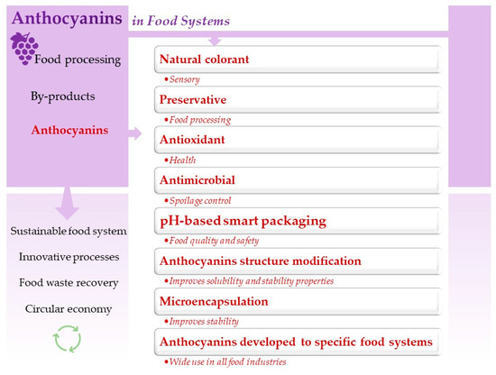 Anthocyanins can be recovered from food agri-food by-products. It is an important strategy to improve the food chain, especially to develop a sustainable food system, by using innovative processes and a food waste recovery approach. The second part of this figure (right) brings the anthocyanin uses commonly described by literature and industry, such as natural colorants, preservatives, antioxidants, antimicrobials, and health-promoting agents, as well as the innovative uses recently described in scientific reports; for instance, the pH anthocyanin-based smart packaging, and anthocyanin structure modification. Microencapsulation with macromolecules, such as proteins and polysaccharides, has been reported to enhance the anthocyanins’ stability during food processing and storage and over the human gastrointestinal digestion system. Food systems present different behavior and, as a consequence, the food technologists should carefully develop anthocyanin formulations appropriate to these specific systems using, for example, the strategies presented herein. Certainly, novel purposes will appear over time about these multi-property biomolecules. Nevertheless, the literature data clearly demonstrate that the food industry may extensively explore anthocyanins as food additives and functional ingredients.