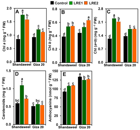In comparison to the control, LRE1 and LRE2 Shandaweel leaves exhibited increases in the contents of chlorophyll (Chl) a (by 106.04 and 85.25%, respectively), Chl b (by 38.75 and 40.51%, respectively), and Chl (a + b) (by 84.97 and 71.24%, respectively) (Figure 1A–C). Similarly, a substantial enhancement in the contents of Chl a (by 31.19 and 20.71%, respectively), Chl b (by 19.49 and 42.45%, respectively), and Chl (a + b) (by 27.40 and 27.76%, respectively), was observed in LRE1 and LRE2 Giza 20 leaves relative to the corresponding control values (Figure 1A–C). Furthermore, although carotenoid content increased by 85.03% in LRE1 Shandaweel leaves in relation to the control, no distinct differences were observed for carotenoid contents in the control, LRE1, or LRE2 Giza 20 leaves (Figure 1D). Surprisingly, anthocyanin contents correspondingly increased by 17.23 and 18.79% in LRE1 and LRE2 Shandaweel leaves, respectively, but the contents were attenuated by 6.64 and 5.02% in LRE1 and LRE2 Giza 20 leaves, respectively, in comparison to the control (Figure 1E).