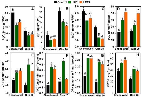 Compared to the control, the levels of hydrogen peroxide (H2O2) decreased by 37.02 and 28.06% in LRE1 and LRE2 Shandaweel bulbs, respectively. Likewise, both LRE1 and LRE2 Giza 20 bulbs displayed a substantial decrease in the content of H2O2 by 27.86 and 21.46%, respectively, relative to the control (Figure 2A). Furthermore, the contents of superoxide (O2•−) and malondialdehyde (MDA) in LRE1 Shandaweel bulbs decreased by 39.01 and 26.63%, respectively (Figure 2B,C). LRE1 and LRE2 Giza 20 bulbs displayed a significant decline in the levels of O2•− (by 30.22 and 40.08%, respectively) and MDA (52.69 and 58.96%, respectively), relative to the values of the control (Figure 2B,C). In relation to the control, a sharp enhancement in the activities of superoxide dismutase (SOD) (by 81.34 and 136.11%), ascorbate peroxidase (APX) (223.14 and 201.29%), glutathione peroxidase (GPX) (106.71 and 102.08%), and glutathione S-transferase (GST) (36.62 and 50.51%) was noticed in LRE1 and LRE2 Shandaweel bulbs, respectively (Figure 2D,F–H). Nevertheless, comparable levels of catalase (CAT) activity were found in the control and LRE1 Shandaweel bulbs, whereas CAT activity was enhanced by 73.29% in LRE2 Shandaweel bulbs versus the control (Figure 2E). Similarly, the activities of SOD, CAT, GPX, and GST were noticeably enhanced by 39.67, 264.64, 170.80, and 69.53% in LRE1, and by 116.35, 184.35, 149.25, and 55.24% in LRE2 Giza 20 bulbs over the corresponding control values (Figure 2D–H). Additionally, APX activity substantially increased by 172.69% in LRE1 Giza 20 bulbs relative to that of the control (Figure 2F).