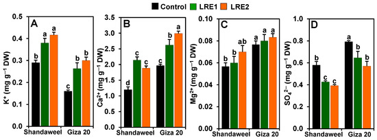 In relation to the control, the contents of K+ and Ca2+ significantly increased in LRE1 Shandaweel bulbs by 31.03 and 78.61%, respectively, and in LRE2 Shandaweel bulbs by 43.68 and 57.50%, respectively (Figure 3A,B). Likewise, a noteworthy improvement was noted for the contents of K+ (by 64.58 and 87.50%) and Ca2+ (33.16 and 51.95%) in the LRE1 and LRE2 Giza 20 bulbs, respectively, relative to the corresponding control values (Figure 3A,B). Nevertheless, LRE1 and LRE2 Shandaweel bulbs, and LRE1 and LRE2 Giza 20 bulbs displayed no significant differences in magnesium ion (Mg2+) levels compared to the respective control (Figure 3C). On the other hand, the contents of SO42− in LRE1 and LRE2 Shandaweel bulbs substantially decreased by 26.44 and 32.18%, respectively, compared to the control (Figure 3D). Similarly, LRE1 and LRE2 Giza 20 bulbs also displayed a significant decline in the content of SO42− (by 18.49 and 28.15%, respectively), relative to the control (Figure 3D).