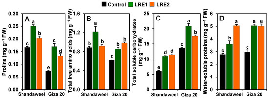 In comparison with the corresponding values obtained from the control, both LRE1 and LRE2 Shandaweel bulbs exhibited a sharp increase in the contents of proline (by 50.00 and 22.00%, respectively), total soluble carbohydrates (81.30 and 89.16%, respectively), and water-soluble proteins (28.61 and 81.20%, respectively) (Figure 4A,C,D). The total free amino acids content increased by 37.75% in LRE1 Shandaweel bulbs only in relation to the control (Figure 4B). On the other hand, the contents of proline, total free amino acids, total soluble carbohydrates, and water-soluble proteins increased by 131.82, 39.32, 52.35, and 69.04%, respectively, in LRE1, and by 81.82, 59.55, 28.92, and 67.49%, respectively, in LRE2 Giza 20 bulbs over the corresponding control values (Figure 4A–D).