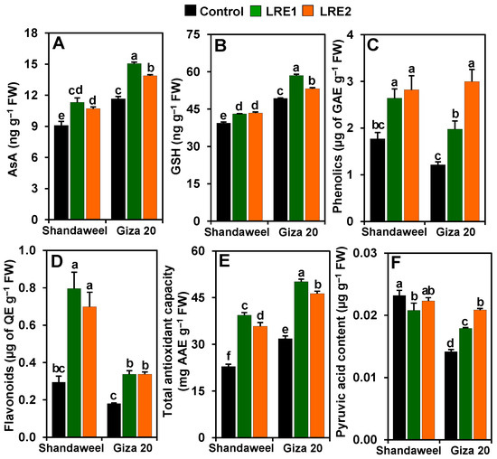 Significant improvements in the levels of ascorbic acid (AsA) (by 24.38 and 17.67%), reduced glutathione (GSH) (9.36 and 10.24%), phenolics (49.16 and 59.31%) and flavonoids (170.25 and 137.62%), and the total antioxidant capacity (72.51 and 56.63%) were recorded in the LRE1 and LRE2 Shandaweel bulbs, respectively, when contrasted with the corresponding control values (Figure 5A–E). Nevertheless, the pyruvic acid level decreased by 10.15% in LRE1 Shandaweel bulbs only relative to the control (Figure 5F). LRE1 and LRE2 Giza 20 bulbs exhibited noteworthy improvements in the contents of AsA (by 29.01 and 19.04%, respectively), GSH (18.57 and 7.87%, respectively), phenolics (68.89 and 146.61%, respectively), flavonoids (86.93 and 86.93%, respectively), pyruvic acid (26.31 and 47.16%, respectively), and the total antioxidant capacity (57.31 and 45.40%, respectively) versus the corresponding control values (Figure 5A–F).