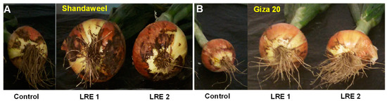 Pungency level is an important quality attribute in onion bulb. Although onion pungency is preferable in many applications (e.g., sauce), low-pungent onion cultivars are highly preferable in households, as well as in extensive use in retail, food service, and numerous food industries, owing to their minimal lachrymatory properties and ease of use as a fresh and uncooked ingredient [44,45]. Pyruvic acid, a product accompanied by the formation of different thiosulfinates through alliinase, is widely recognized as a measure of the pungency index in onions [46]. Our findings displayed that the pretreatments with LRE kept the pyruvic acid content unchanged in the bulb of the Shandaweel cultivar, whereas it dramatically increased it in the Giza 20 cultivar (Figure 5F), indicating that LRE actions on pungency might be cultivar-dependent. Thus, LRE pretreatment could be used for suppression of pungency in the Shandaweel cultivar for better acceptability by end-users.